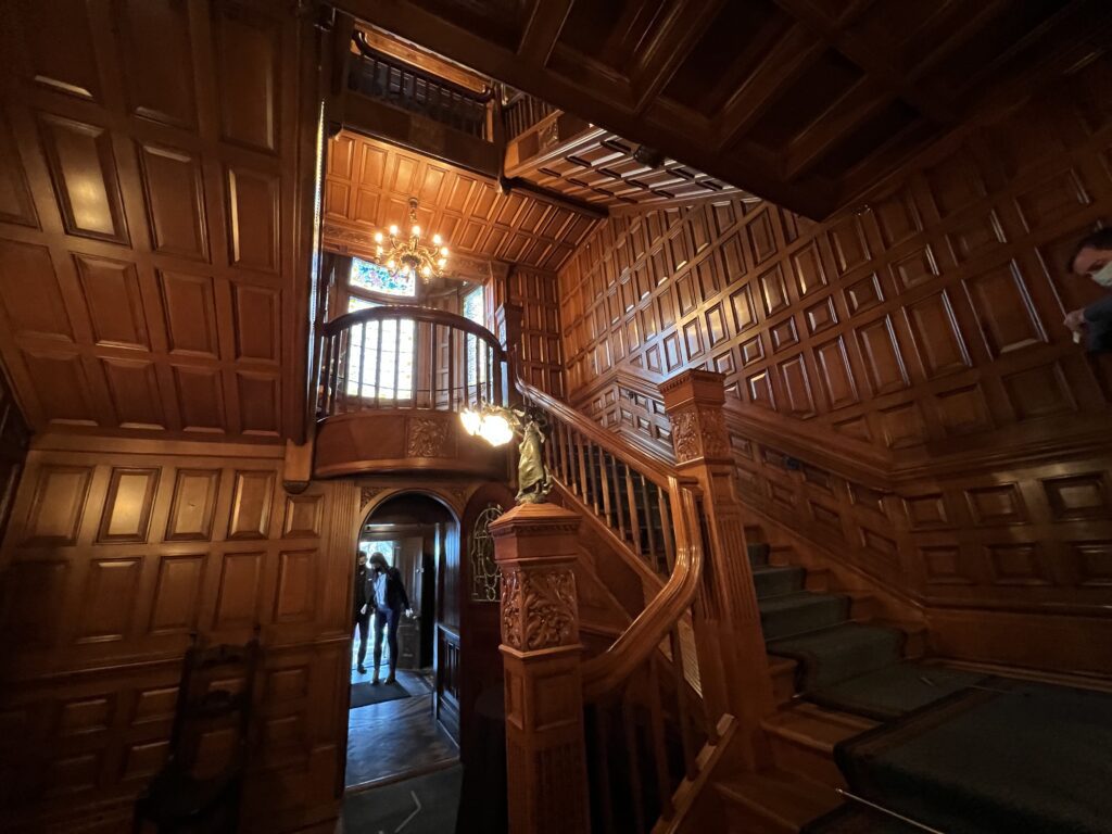 The mansion has thirty nine rooms, intricate woodwork, stained glass windows, and dramatic staircases that climb through four levels of Victorian design.